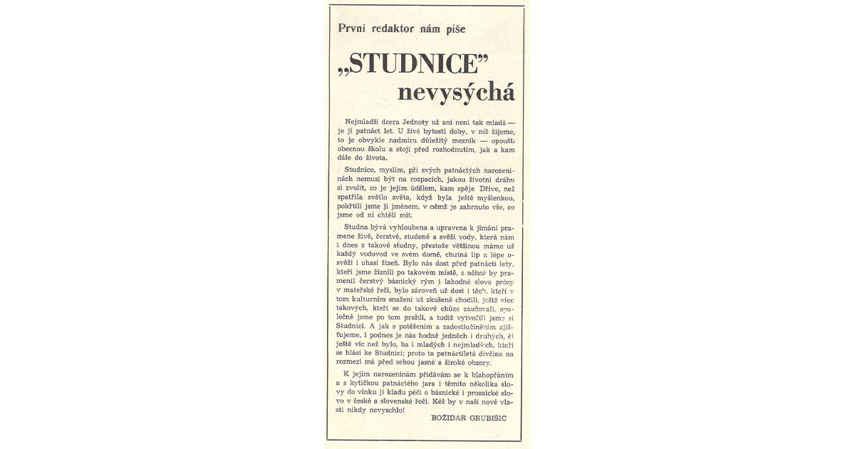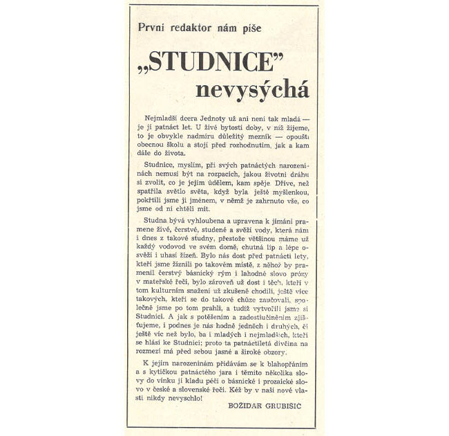 koje su naši češki preci u 19. stoljeću donijeli na područje današnje Republike Hrvatske. Izdajemo tjednik Jednotu, dječji časopis Dječji kutak, godišnjak Češki pučki kalendar (1953) te Pregled kulturnih i literarnih, školskih i povijesnih pitanja (1962).